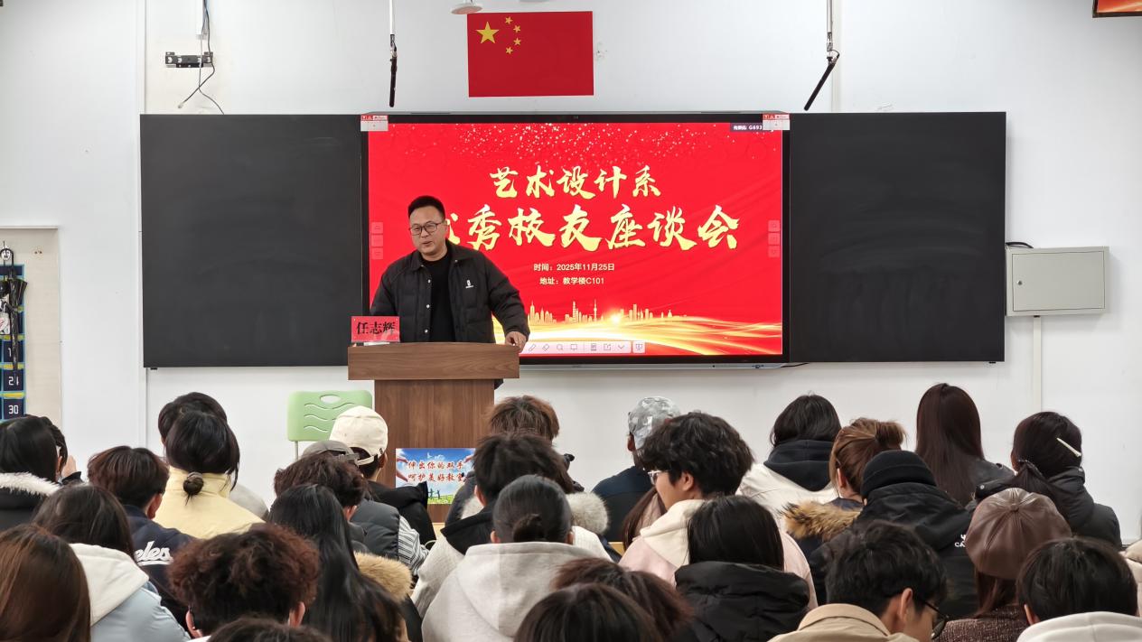 为助力艺术设计系学子明确成长方向、积累实践经验,11月15日下午,艺术设计系在教学楼C101教室举办了优秀校友座谈会。本次活动特邀 2005届室内与家具设计班优秀校友、内蒙古佰政邦企业服务有限公司总经理任志辉返校,结合自身从校园创业到深耕行业的多年实践经验,与百余位在校学子面对面交流分享。